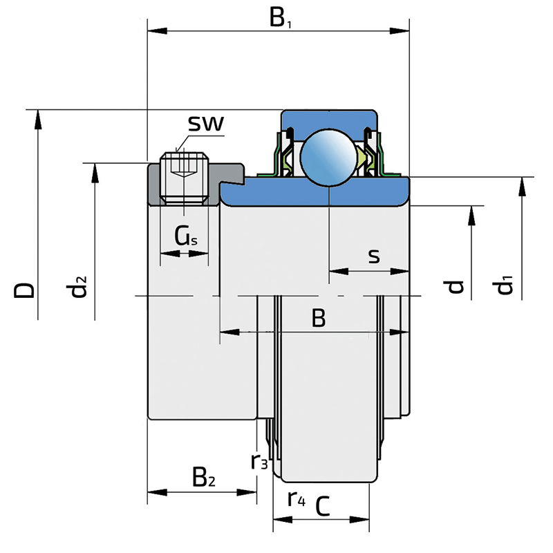 Dual sealing, protection cover placed on the inner ring protects against rough impurity particles and makes the labyrinth with the sheet part of the seal; then the sealing S type, with the labyrinth between the sheet part and the rubber lip that conducts the contact sealing. The friction and speeds are the same as with S but has much better protection against rough impurity particles. It is very good sealing system: the sheet part protects the seal from the soil, dust and rough particles. At the same time makes the labyrinth with the rubber part. The rubber part provides the contact sealing that prevents the penetration of the finer impurities, water, moisture, steam etc. Suitable for heavier conditions due to better protection against foreign matters. It is used with the Y bearings (standard).