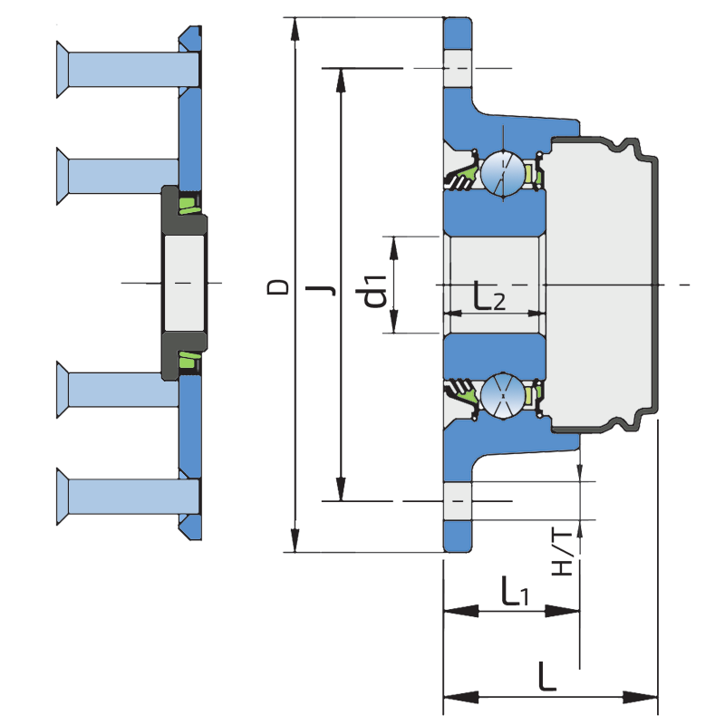 3-lip seal on the base side and the S seal with Metal protective cap on the front side. 3-lip seal on the base side also protected with attached disc, protecting the bearing from contamination. S seal with a Metal protective cap on the front side eliminates bearing contaminants.