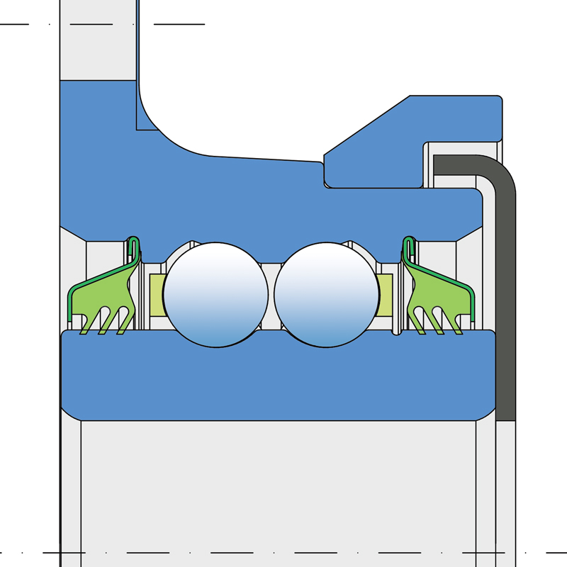 Sealing T SEAL / T SEAL + METAL SHIELD 3-lip seal on the base side and the 3-lip seal with Metal shield on the front side. 3-lip seal on the base side protects the bearing from contamination. 3-lip seal with a Metal shield on the front side eliminates bearing contaminants.