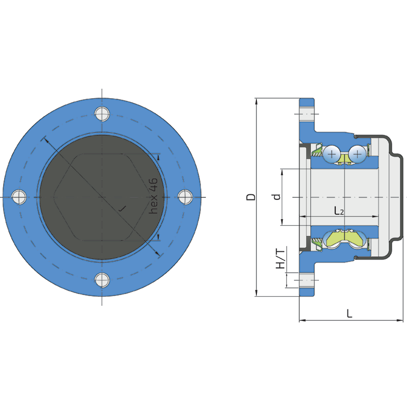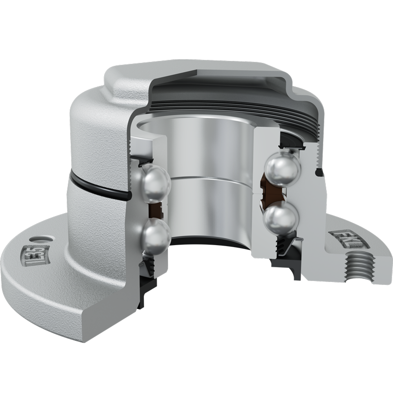Sealing PLASTIC COVER+T SEAL / RS SEAL+METAL PROTECTIVE CAP 3-lip seal on the base side and the RS seal with metal protective cap on the front side. The plastic cover on the base side protects the seal from mechanical damage. 3-lip seal on the base side also protected with attached disc, protecting the bearing from contamination. The RS seal with a Metal protective cap on the front side eliminates bearing contaminants.