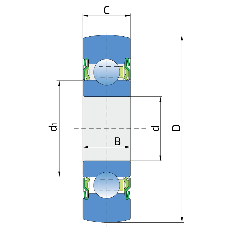 Single lip seal with the labyrinth between the sheet part and the rubber lip which conducts the contact sealing. The friction and speeds are the same as with RS but provides much better protection against the rough impurity particles. This is very good sealing system: the sheet part protects the seal from the soil, dust and rough particles. At the same time makes the labyrinth with the rubber part. The rubber part provides contact sealing which prevents penetration of finer impurities, water, moisture, steam etc. Suitable for neutral conditions because of the presence of the foreign materials. It is used with the Y bearing (standard) and deep groove ball bearings.