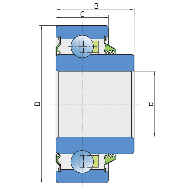 S seal on the base side and 3-lip seal on the front side which is exposed to contaminants. The 3-lip seal on the front side protects the bearing from contaminant penetration.