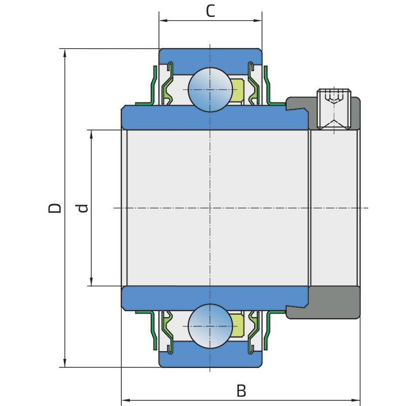 Dual sealing, protection cover placed on the inner ring protects against rough impurity particles and makes the labyrinth with the sheet part of the seal; then the sealing S type, with the labyrinth between the sheet part and the rubber lip that conducts the contact sealing. The friction and speeds are the same as with S but has much better protection against rough impurity particles. It is very good sealing system: the sheet part protects the seal from the soil, dust and rough particles. At the same time makes the labyrinth with the rubber part. The rubber part provides the contact sealing that prevents the penetration of the finer impurities, water, moisture, steam etc. Suitable for heavier conditions due to better protection against foreign matters. It is used with the Y bearings (standard).