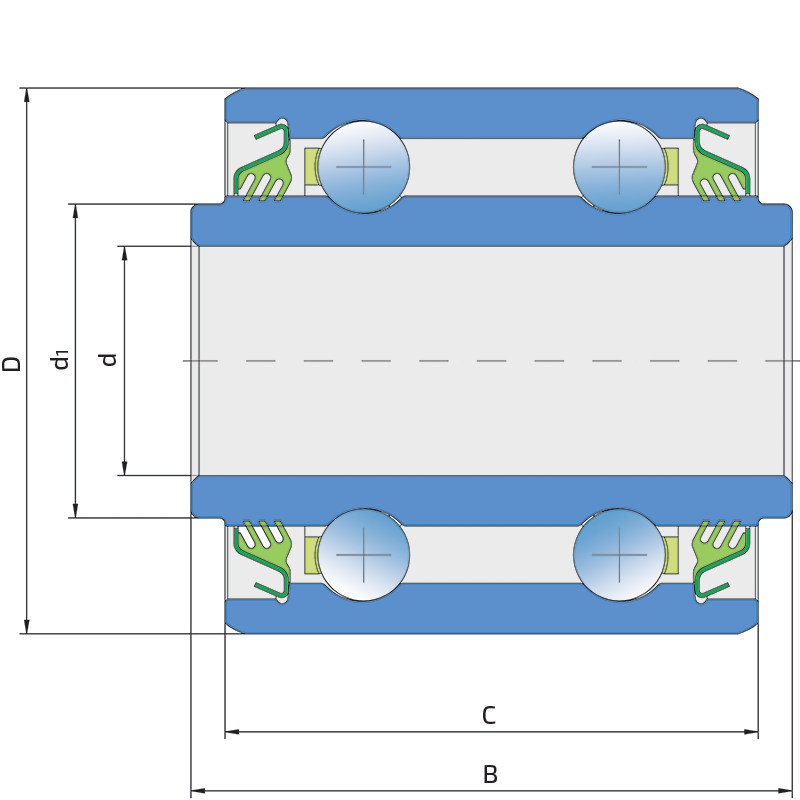 3-lip seal on the both side of the bearing, provides equal protection against contamination. Recommended for application where the possibility of contamination is the same on the both side.
